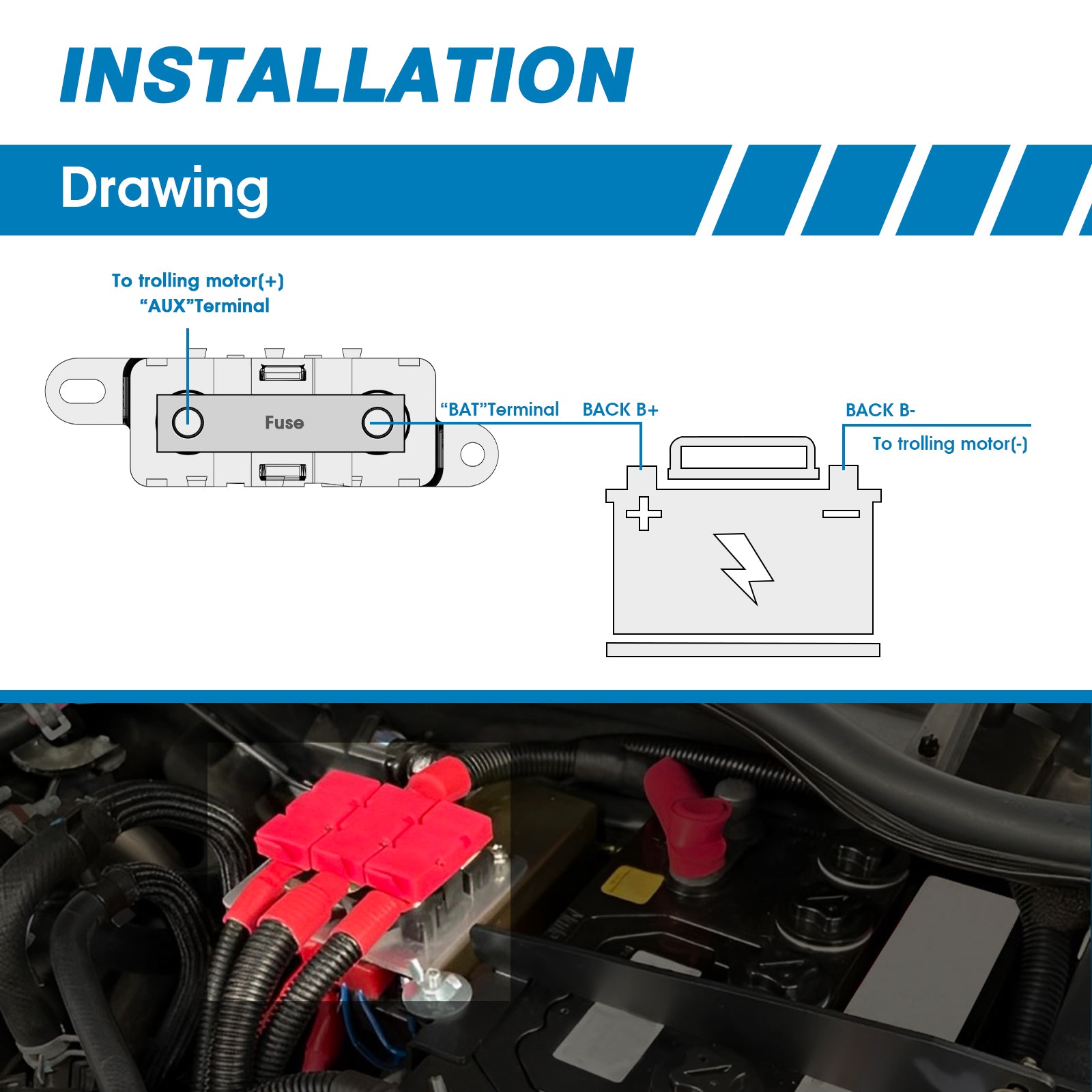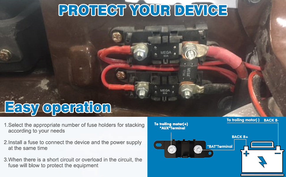 - [Protection] mega Fuse holder If equipped with mega fuse, can protect the equipment from short circuit or overload